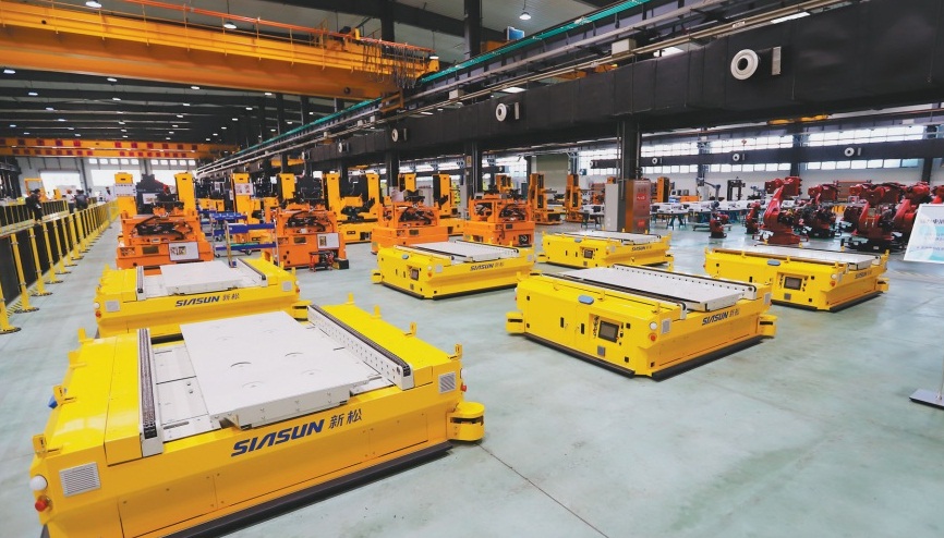 大路兩旁,廠房林立。生產(chǎn)線上,移動機器人自由穿梭,紅色的機械手上下翻飛。