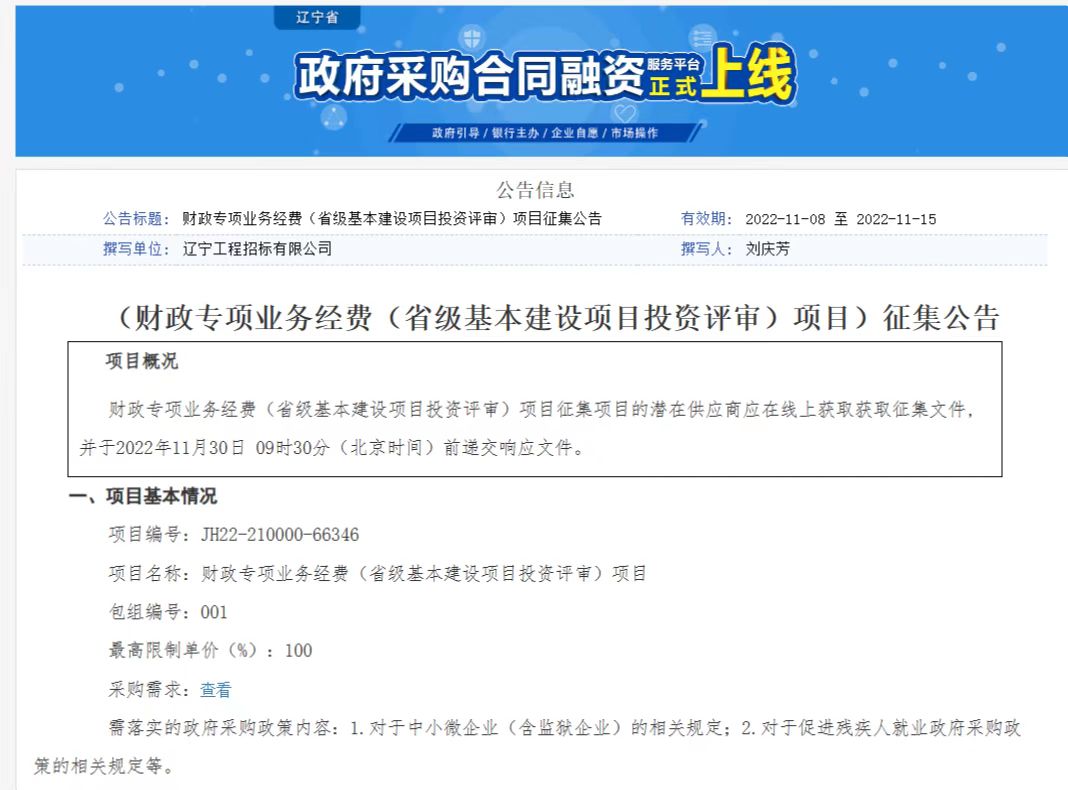 遼寧工程招標有限公司受遼寧省財政廳的委托,代理的“專項業(yè)務(wù)經(jīng)費(省級基本建設(shè)項目投資評審)項目”采購工作圓滿完成。該項目是遼寧省首個委托社會代理機構(gòu)實施的省本級框架協(xié)議采購項目,對于全省框架協(xié)議采購工作具有引領(lǐng)示范作用。