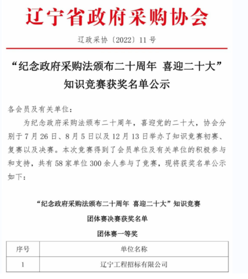 為紀(jì)念政府采購法頒布二十周年,喜迎黨的二十大,促進(jìn)行業(yè)健康發(fā)展,提高政府采購當(dāng)事人執(zhí)業(yè)水平,遼寧省政府采購協(xié)會舉辦了知識競賽。公司選派的代表隊在初賽、復(fù)賽、決賽等各環(huán)節(jié)均表現(xiàn)出色,憑借過硬的整體技術(shù)實(shí)力和綜合能力,最終以優(yōu)異成績獲得團(tuán)體賽第一名。