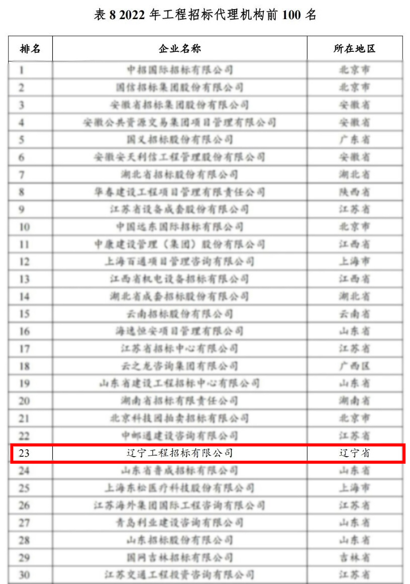 2023年8月,中國(guó)土木工程學(xué)會(huì)建筑市場(chǎng)與招標(biāo)投標(biāo)研究分會(huì)組織編寫了2022年度工程招標(biāo)代理行業(yè)發(fā)展報(bào)告》,報(bào)告公布的2022年工程招標(biāo)代理機(jī)構(gòu)百?gòu)?qiáng)名單中,公司作為遼寧省唯一入選代理機(jī)構(gòu),榮獲全國(guó)23名。