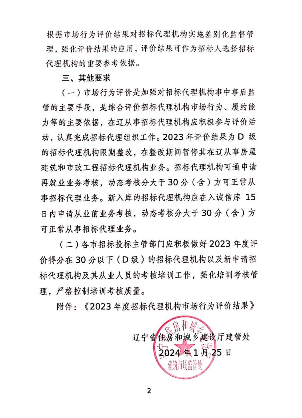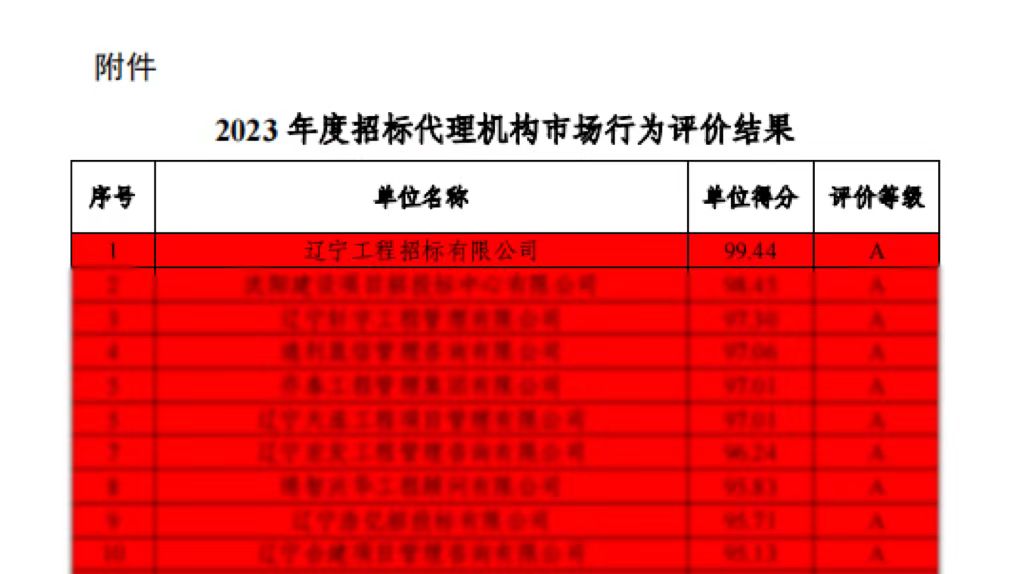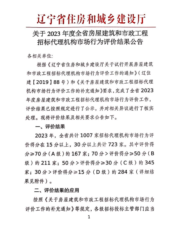 1月25日,在遼寧省住房和城鄉(xiāng)建設(shè)廳發(fā)布的《2023年度全省房屋建筑和市政工程招標代理機構(gòu)市場行為評價結(jié)果公告》中,公司以99.44分的優(yōu)異成績再次蟬聯(lián)第一名,是自2019年起,連續(xù)第五年問鼎此項殊榮。