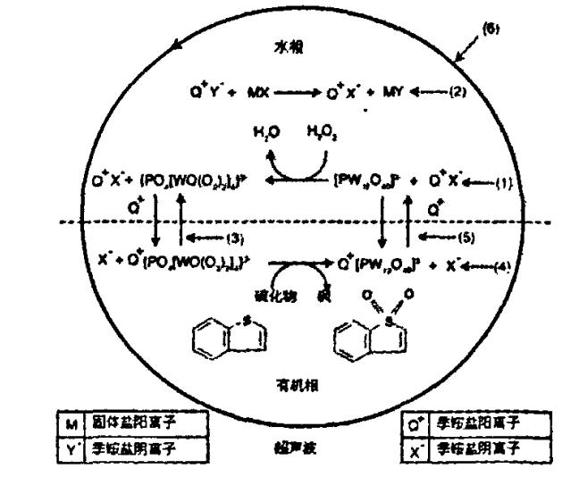Wan等[12]以磷鎢酸及其鹽為催化劑,TMAF為相轉(zhuǎn)移劑,結(jié)果表明,在常溫常壓和超聲波作用下,對含硫量不同的海軍運輸柴油的研究結(jié)果表明,脫硫率可達到95%以上,然后硫含量都低于1.5×l0-5(質(zhì)量分?jǐn)?shù))。超聲波氧化脫硫過程見圖l,由6個基本步驟組成:①在過量H2O2存在下,將多氧金屬鹽氧化成多氧過氧金屬鹽{PO4[WO-(O2)2]4}3-;②水相中的固.液陰離子相互交換;③季銨鹽反應(yīng)作為相轉(zhuǎn)移劑;④有機硫化物被具有高選擇性的多氧金屬氧化為相應(yīng)的砜;⑤被還原的多氧金屬與相轉(zhuǎn)移劑分離并返回到水相,完成了催化劑循環(huán);⑥超聲波強化氧化反應(yīng)的效率。
